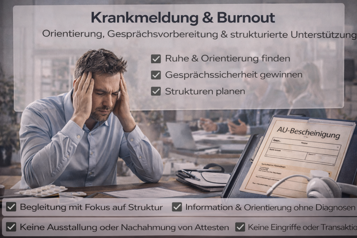 Gerne besprechen wir in einem unverbindlichen Gespräch, welche unterstützenden und vorbereitenden Leistungen im Zusammenhang mit Krankmeldung und Burnout sinnvoll sind – und wo die klaren Grenzen unseres Services liegen.